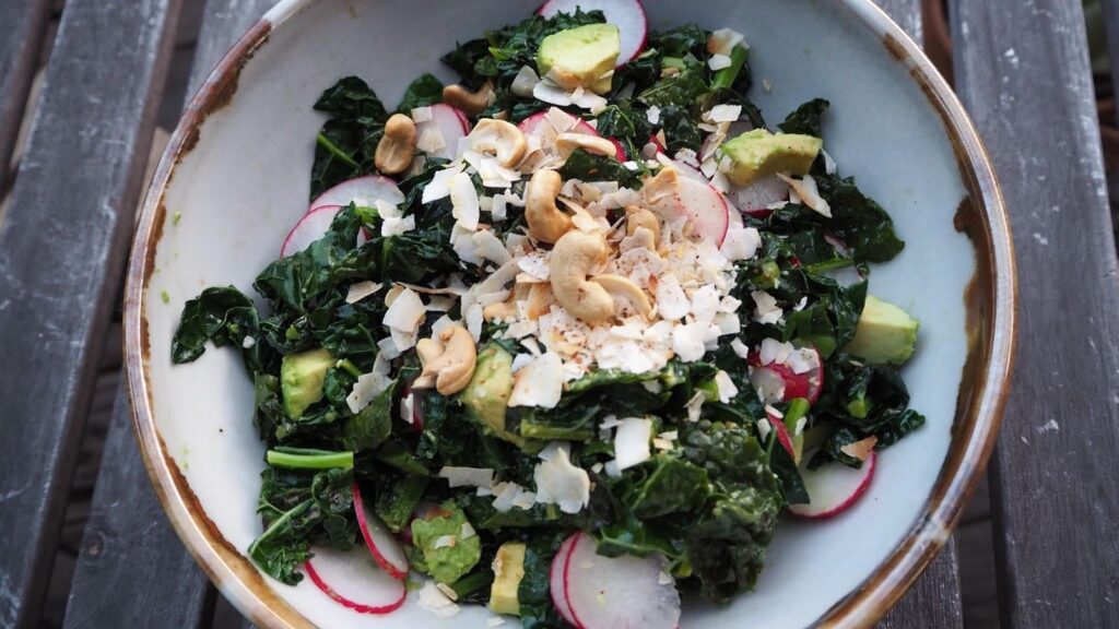 El kale es un tipo de col rizada que se puede comer crudo , al igual que el rabanito, que es una raíz de bonito color fucsia por fuera y blanco por dentro. Los juntamos en una ensalada, a la que también le ponemos palta. La combinación, además de saludable, es deliciosa y muy fácil de preparar. ¡Lleno de nutrientes, frescura y sabor!