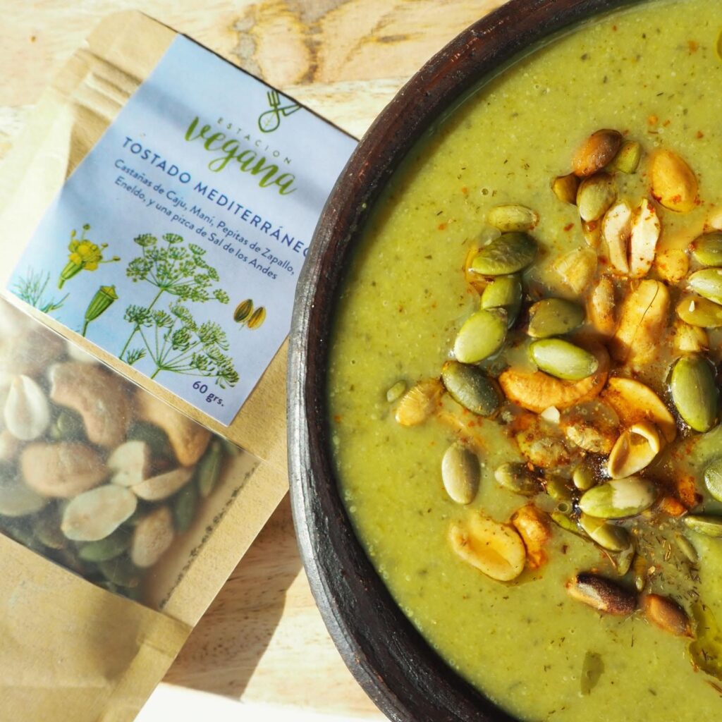 Coloque la crema de verduras en un bowl, y le añades dos o mas cucharadas de Tostado Mediterráneo. ¡Disfruta y comparte!