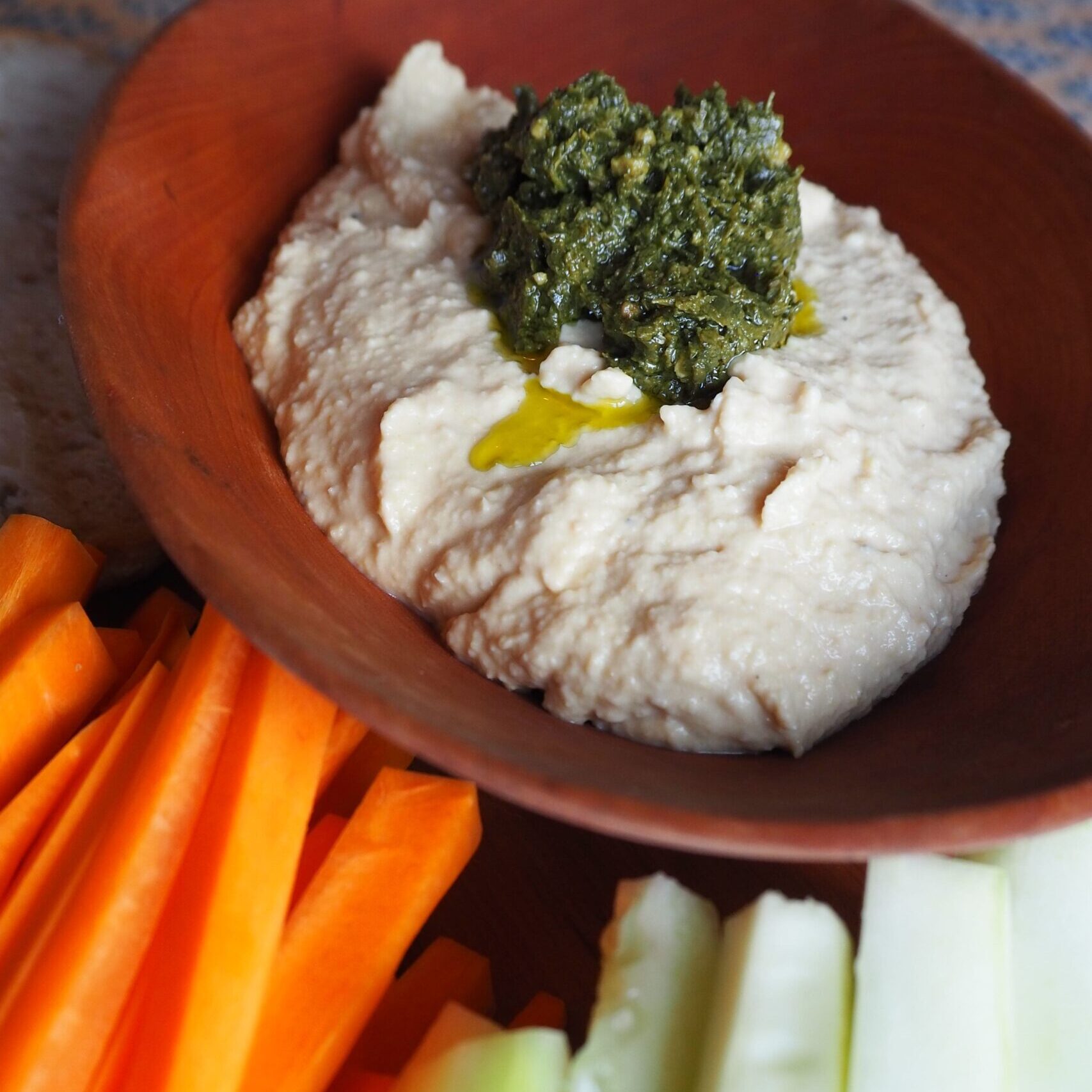 Pondremos el bowl sobre un plato o tabla y lo rodearemos con los vegetales cortados en bastoncitos. Así es fácil de tomar y untar en el humus y Pesto de Kale.